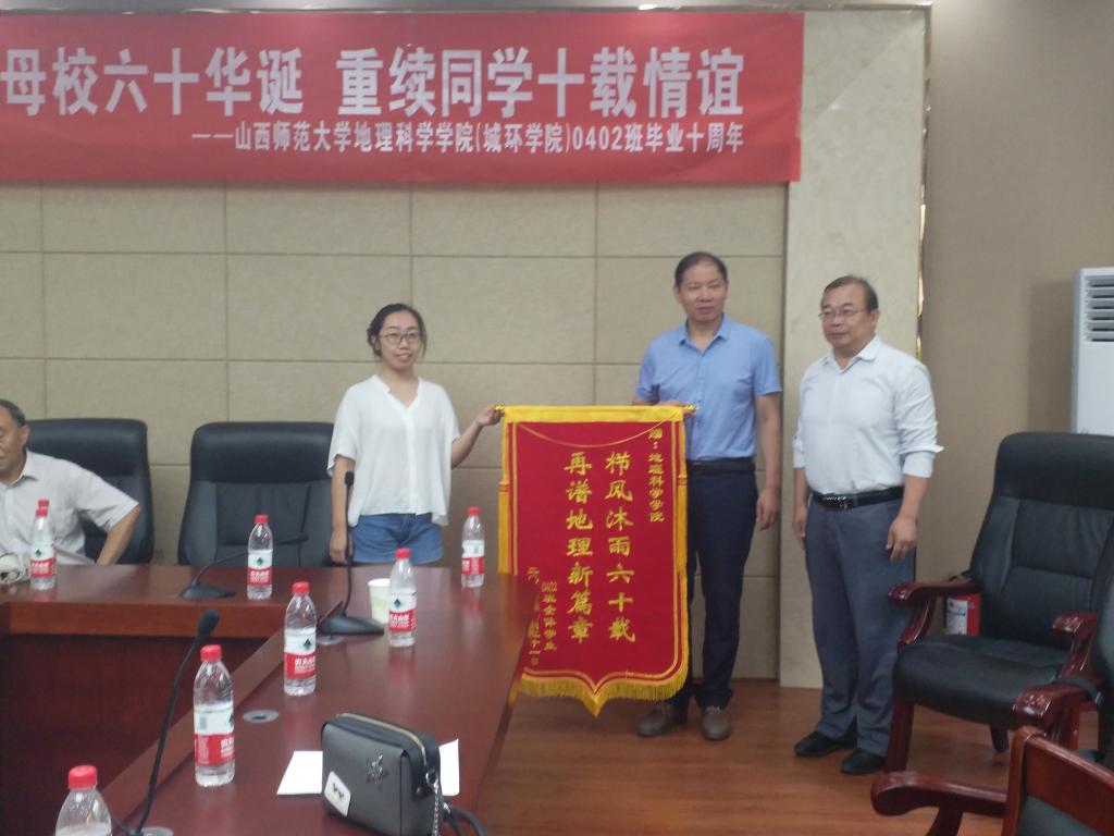 最后,到会的0402班校友回忆了大学在校的美好时光,畅谈了工作十年来的心路历程。0402班校友代表向母校必赢766net手机版和老师赠送锦旗和鲜花,以示感谢和支持。