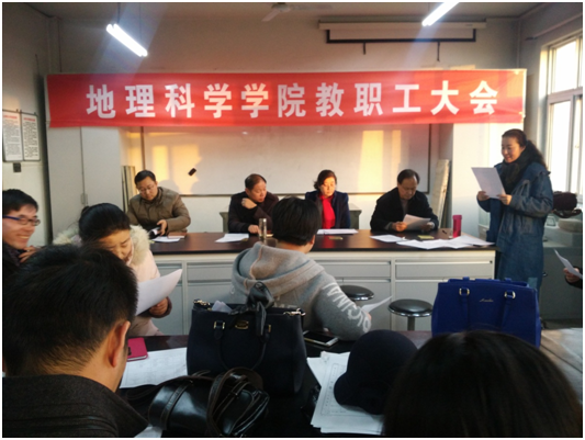院长代表张永清同志作了《院长工作报告》。报告指出,过去的2016,在校党委、校行政的正确领导下,在上级相关部门的关心和大力支持下,学院领导班子积极转变工作理念和发展理念,认真落实“一岗双责”和“两个责任”,推进工作作风转变。近三年从中科院和重点院校引进青年博士20余人,与中科院地理科学与资源研究所孙九林院士签署特聘教授工作协议,自然地理学成功入选学校“十三五”学科攀升计划重点学科方向,学院专业成为学校优势专业,学院发展步入了快车道,极大的激励和调动了全院教职工工作的热情和积极性、主动性和创造性。我们抓好理论学习,扎扎实实开展“两学一做”学习教育,以“党建带团建”工作为引领,积极构建青年学生综合素质提升和锻炼成长服务体系,坚持以教学为中心,以科研促发展,以育人为目的,以质量求生存的指导思想,紧抓师资队伍建设这一关键环节,坚持实施人才强院战略,扎实推进学院工作,较好的完成了2016年度的各项任务,在党建、人才引进、学科建设、办学质量、教学水平、实验条件的改善、学生和学院的管理工作等方面都得到了较快的发展。
