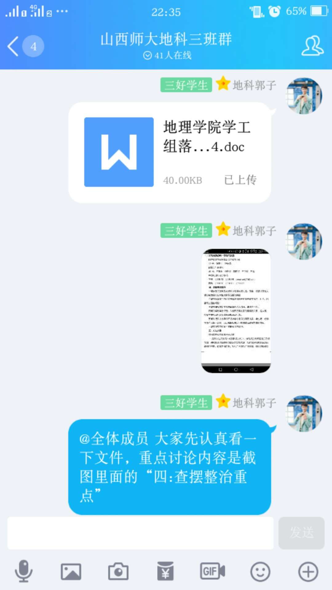 我院本科在校各班级在各辅导员的组织下开展了“教育领域腐败专项整治”动员会的主题班会,各辅导员首先都认真详细的传达了校党委专项整治会议精神和重点工作要求,宣读了院党委会议研究制定的专项整治工作实施意见,并就专项整治工作实施意见的内容、环节和相关要求进行宣讲和部署。并在最后公示院党委成立的专项整治工作领导小组成员及相关举报电话和电子邮箱,鼓励引导学生参与监督,积极举报,防微杜渐,促进我院学生工作作风的持续好转。本科1502和1503班同学在外实习,辅导员在QQ班群中组织开展网络班会,并认真传达了相关文件精神,同学们讨论热烈。我院研究生也在王蕾老师和郝艳红老师的共同组织下在04618教室召开“教育腐败整治工作”动员大会,学习相关文件内容及精神。