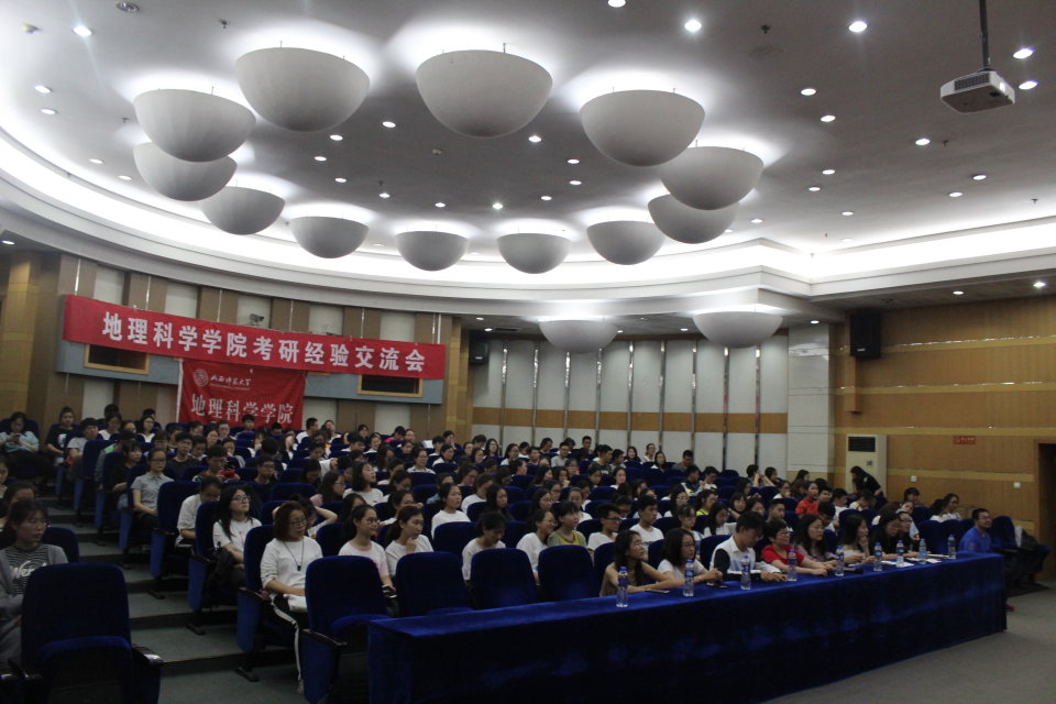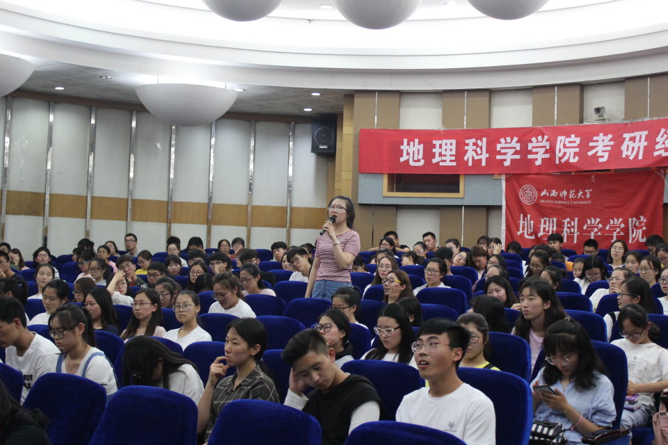 随后,五位考研成功的学生代表进行了经验分享。考取华东师范大学的赵茜同学首先进行了分享,她介绍了自己的备考时间安排、各科备考准备及复试经验,着重介绍了在数学考试方面的经验,鼓励同学们放远眼光,志存高远。考取中科院新疆所的高宇婷同学讲述了自己的考研经历,她说,虽然中科院新疆所地处西部,但能在祖国需要的地方参与研究工作是幸运而且值得的事情。聂雨欣同学作为跨专业考研代表分享了考研心路历程,她强调了兴趣的重要性,就跨专业考试给出了具体建议。张馨匀同学考取了英国谢菲尔德大学城乡规划专业,她就出国留学考取研究生的相关事项进行了详细介绍。崔玉同学强调了专业院校选择的重要性,她根据自身经历就考研心态、学习、时间安排等与大家进行了交流。五位同学分享结束后,主持人为大家介绍了到场的其他考研成功的同学以及他们的录取院校,在场学生踊跃向他们进行了提问。
