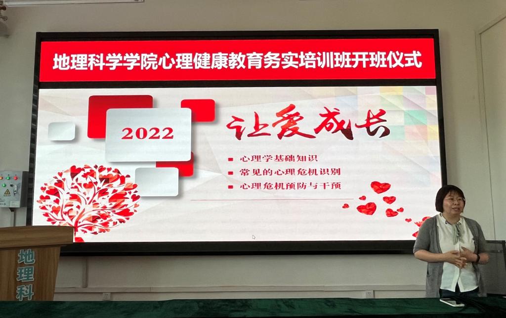 地理学院心理健康教育务实培训班是高校二级学院落实立德树人、育心与育德相统一的一次创举,为切实提高学院教师和辅导员队伍心理健康基本素养和心理疏导干预能力,进一步规范和发展二级学院心理健康教育奠定坚实基础。