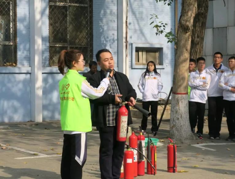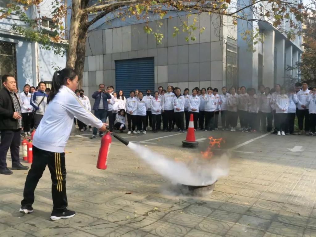 应急疏散演练结束后,全体师生前往东侧体操区进行消防知识现场教学。同学们通过亲自使用二氧化碳灭火器和干粉灭火器学会了如何使用灭火器,知道了使用时要站在火源的上风向瞄准火焰根部进行扫射。