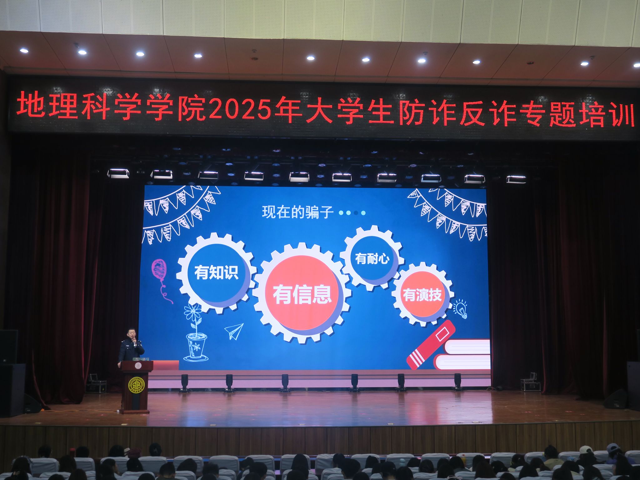 为进一步提高大学生防诈、反诈的意识,提升识别骗局的能力,切实保障学生人身财产安全,4月11日我院在南区科学会堂报告厅开展了2025年大学生防炸反诈专题培训。本次活动荣幸邀请到我校保卫部的裴中瑞警官作为主讲嘉宾,同时由谢碟妮老师担任主持,22级、23级、24级的同学们参加此次讲座。