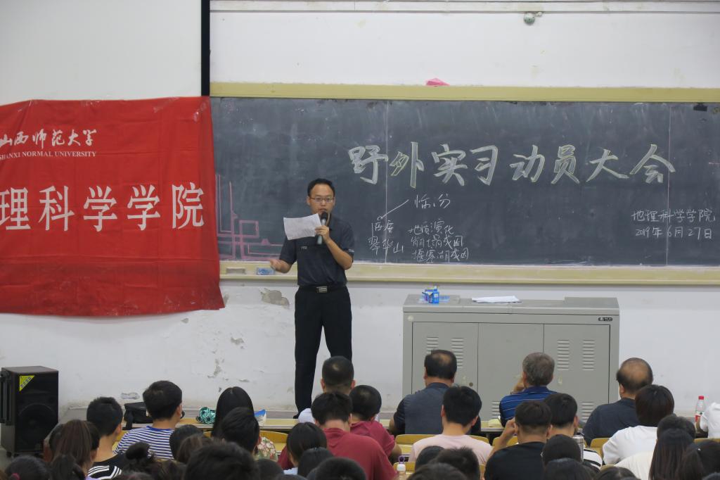 随后,自然地理实习带队教师李明老师自然地理实习时间、实习路线和实习主要站点以简略图的形式做了系统说明。此次自然地理实习涉及翠华山-杨凌-中科院水保所-中科院西北研究院-中科院临泽站-沙坡头-腾格里沙漠-大同等多个实习点,对每个实习点实习内容做了详细介绍。人文地理带队教师张仲伍副教授介绍了人文地理长途实习的时间和线路,人文地理实习途经太原-石家庄-南京-苏州-上海-杭州-临汾等七个主要站点,详细介绍了每个站点的实习内容。两位带队老师强调,实习安排紧凑,任务繁重,希望大家能充分利用野外实习的机会,不断提升自身的地理专业素养,同时能严守实习纪律,不随意脱离集体,要时刻记住自己代表的是山西师范大学的形象,同时在生活中注意细节,备好常用药,做好防晒,为整个实习顺利进行打好基础。