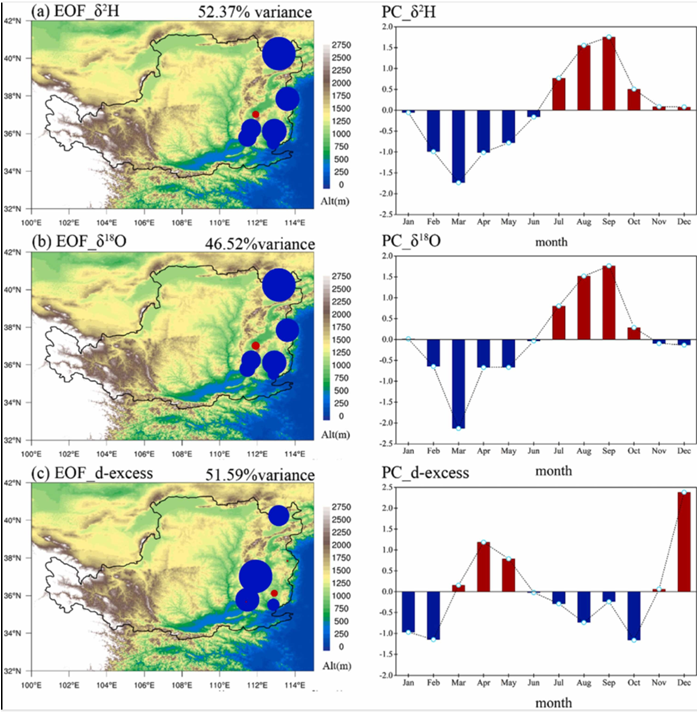 本研究基于环境同位素示踪技术,定量的刻画了区域水汽来源,在黄土高原地区得到重要研究进展。在黄土高原地区,研究发现水汽源区在不同的月份有所不同,西风影响了东黄土高原的北部区域的水汽输送过程。相比之下,东黄土高原地区的中部和南部的水汽输送系统较为复杂。来自东南向的水汽输送对研究区夏季的降水过程有重要影响。夏半年,东黄土高原地区降水的水汽主要来自于渤海、东海以及区域东南部地区。在东黄土高原的两个典型地貌区域的水汽源组成呈现出显著的空间异质性。