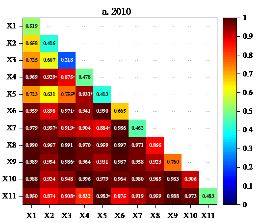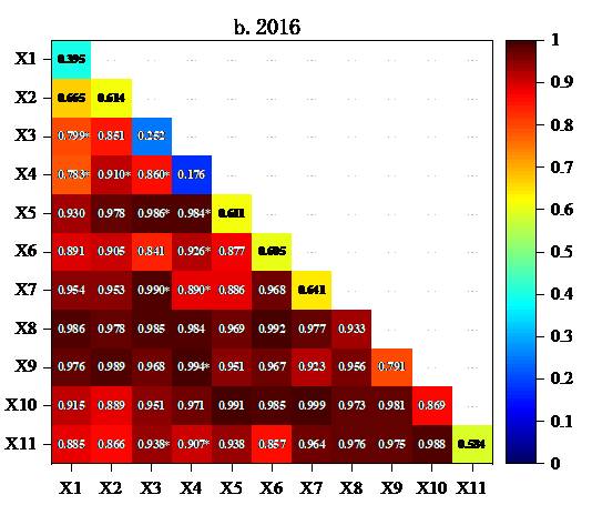 图3 2010、2016、2020年耦合协调度影响因素交互探测结果