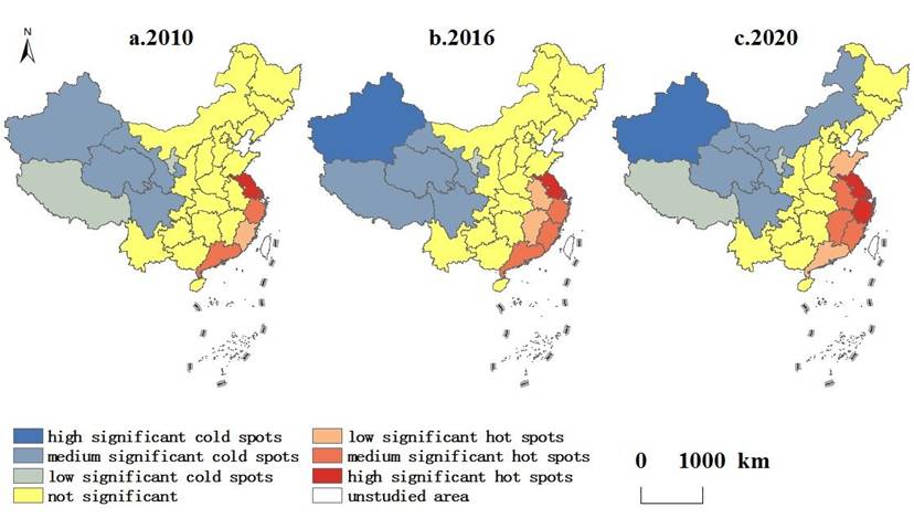 图2 基本公共服务-城镇化-旅游业耦合协调度的冷热点空间格局演变