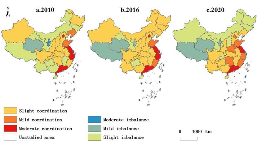 图1 基本公共服务-城镇化-旅游业耦合协调度的空间分布