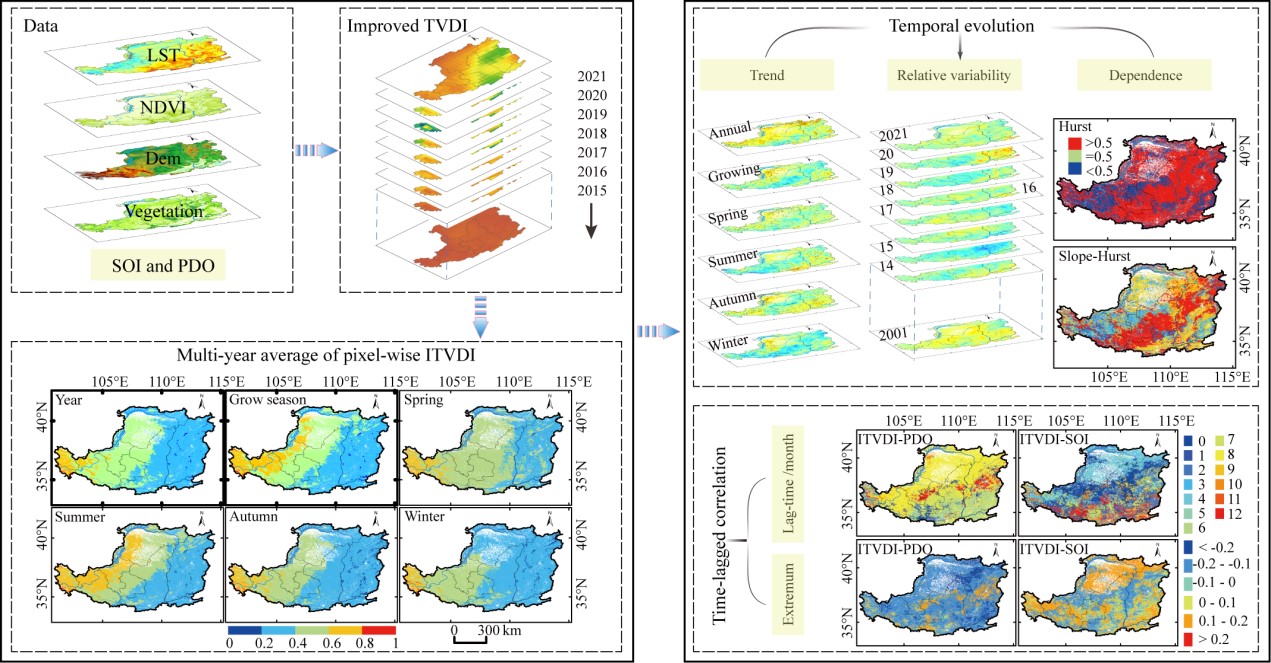 本研究将海拔和纬度引入到温度植被干旱指数(TVDI)的反演中,并利用改进的温度植被干旱指数(ITVDI)评估了2001-2021年黄土高原植被干旱的时空特征。此外,还分析了ITVDI与SOI/PDO的相关性和滞后时间。研究结果有助于干旱监测、风险评估和预警系统,从而为黄土高原和全球类似地区的干旱缓解和管理战略提供宝贵的支持。