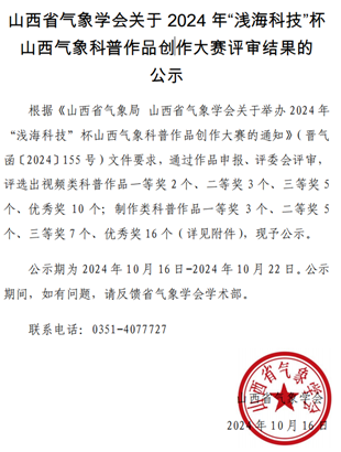 “浅海科技”杯由山西省气象局与山西省气象学会共同主办,是为了加强气象科学知识的普及力度,开展科普视频创作,面向全省气象部门、有关气象类院校和气象科普爱好者而举办的科普作品创作大赛。