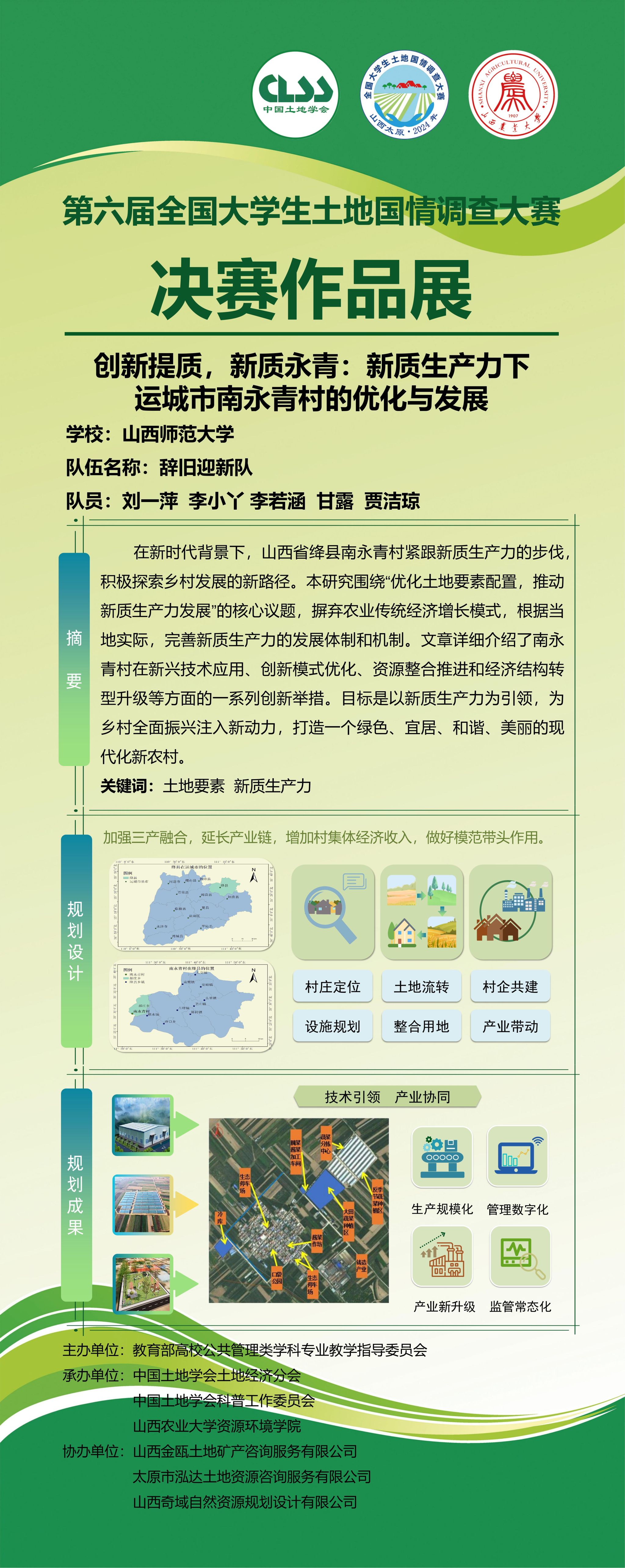 我院陕永杰教授指导的代表队辞旧迎新队,由来自必赢766net手机版的刘一萍、李小丫、李若涵、甘露、贾洁琼组成。参赛项目为《创新提质,新质永青:新质生产力下运城市南永青村的优化与发展》,荣获全国三等奖。这是我院卓越人才培养的又一显著成果。